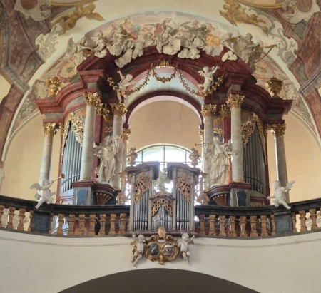 Na kůru stál až do konce 19. století dvoumanuálový barokní nástroj slezského varhanáře Tobiase Meissnera (†1728) z roku 1727, později rozšířený dokonce na tři manuály. Na tradici slezského barokního varhanářství navazuje i novostavba firmy Kánský-Brachtl . Kvůli umístění v atypické původní skříni vyžadovaly varhany důmyslné konstrukční řešení mechanické traktury. Nový nástroj je jedinečný zvukovými kvalitami i řemeslným zpracováním, včetně stylového hracího stolu. Zajímavostí dispozice je zukový efekt slavičího hlasu Rossignol. Netradičně řešená varhanní skříň se sloupy a píšťalovými prospekty vytočenými do stran byla navržena architektem Kiliánem Ignácem Dientzenhoferem (1689-1751). Levou a pravou část propojuje masivní spojovací oblouk. |