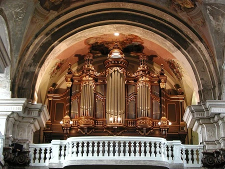 | Popis | Zachovalé a oceňované varhany firmy Rieger stojí v pseudobarokní skříni. Nástroj měl mít původně jen 20 rejstříků, ale pro dostatek financí byl návrh rozšířen na 26 rejstříků. Hlavní stroj a částečně i pedál je ovládán Barkerovou pákou, ostatní stroje mají tradiční mechanickou trakturu. |