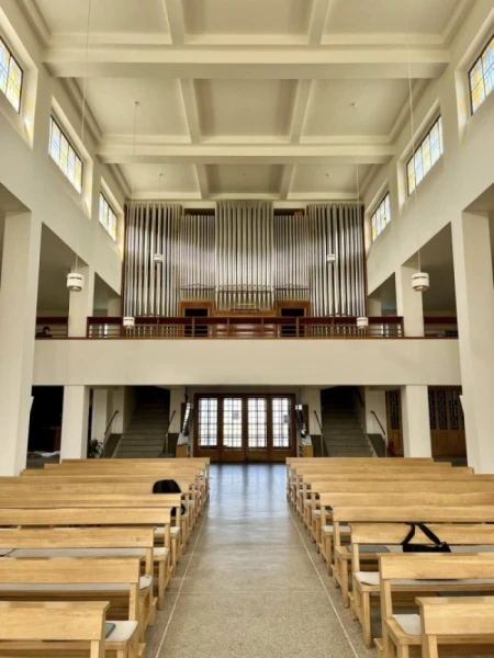 | Popis | Dispozice nových a poměrně velkých varhan firmy Dlabal-Mettler obsahuje množství hlubokých osmistopých hlasů a prozrazuje tak určitou inspiraci v romantickém varhanářství. Výtvarná stránka varhan je inspirována stavebním slohem kostela - funkcionalismem. |